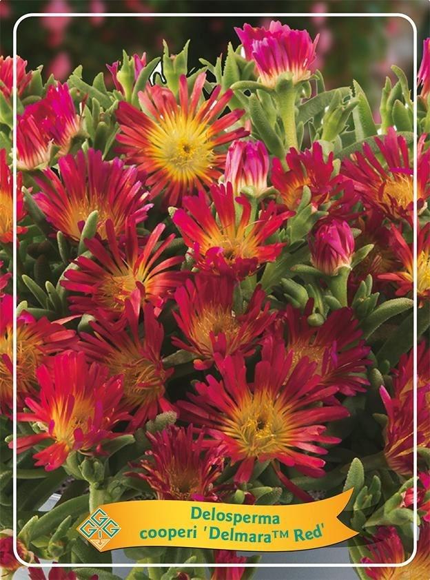 Sončna in izjemno trpežna “ledena rožica” Delosperma cooperi ‘Delmara Red’ je nizka, plazeča se sukulentna trajnica, ki tvori gost, zelen tepih in se poleti do jeseni dobesedno prekrije z živahnimi, rdečimi cvetovi. Cvetovi se odpirajo na soncu in ustvarijo čudovit barvni učinek, zaradi kompaktne rasti pa je odlična za skalnjake, suhozide, obrobe, sušne grede in tudi za korita ali posode. Delosperme so znane po odlični odpornosti na sušo in vročino, zato so idealne za lege, kjer druge rastline težko uspevajo.Nega: