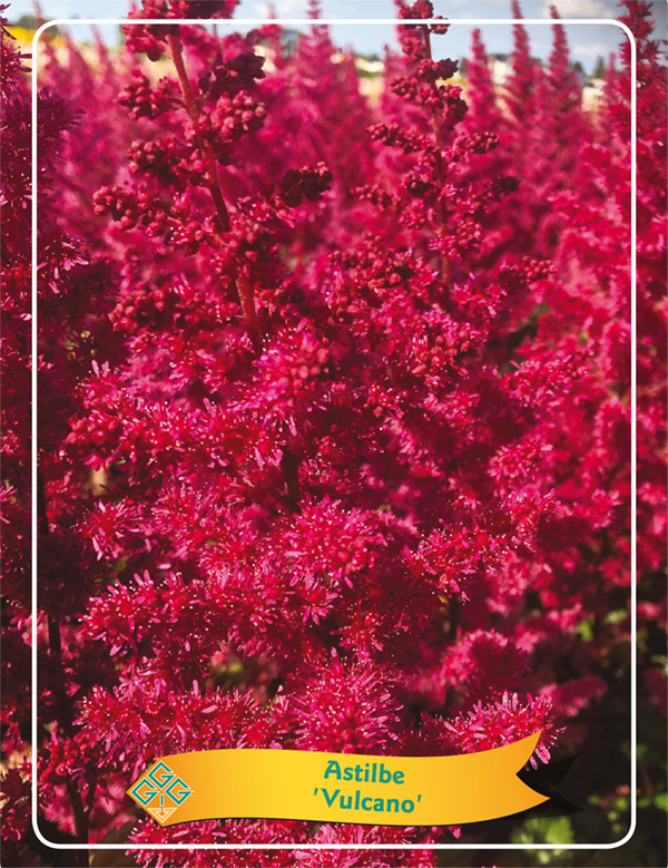 Osupljiva astilba Astilbe ‘Vulcano’ navduši z gostimi, pokončnimi cvetnimi metlicami v intenzivnih rdečih odtenkih, ki poleti ustvarijo močan barvni poudarek v polsenčnih in vlažnejših delih vrta. Cvetovi so rahlo “puhasti” in zelo dekorativni, lepo pa se kombinirajo s hostami, praprotmi, krvavečimi srčnicami in drugimi senčnimi trajnicami. Poleg cvetov je dekorativno tudi fino deljeno, bleščeče zeleno listje, ki ostane privlačno skozi sezono. ‘Vulcan’ je odlična izbira za grede, obrobe, sajenje ob vodi ali v večje lonce, kjer potrebuje več redne vlage.Nega: