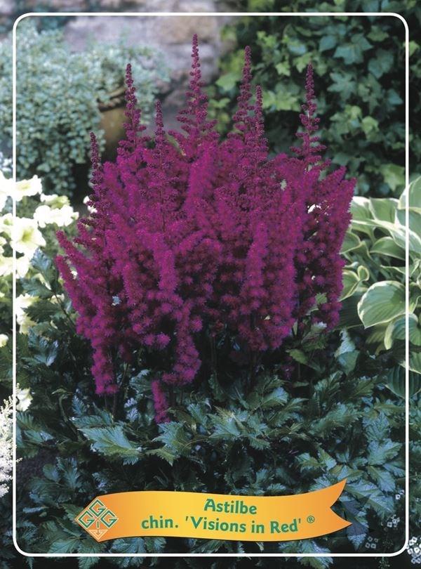 Izjemno dekorativna astilba Astilbe chinensis ‘Visions in Red’ je ena najlepših sort iz serije Visions, znana po gostih, “puhastih” cvetnih metlicah v intenzivnih, temno rdečih do rubinastih odtenkih. Cveti poleti in v polsenčnih gredah ustvari močan barvni poudarek, hkrati pa odlično dopolni hoste, praproti, heuchere in druge senčne trajnice. Poleg cvetov je dekorativno tudi fino deljeno listje, ki tvori lep, kompakten šop. Ker gre za kitajsko astilbo, je pogosto nekoliko bolj tolerantna na kratkotrajno sušo kot nekatere druge astilbe, vendar še vedno najbolje uspeva v enakomerno vlažnih tleh.Nega: