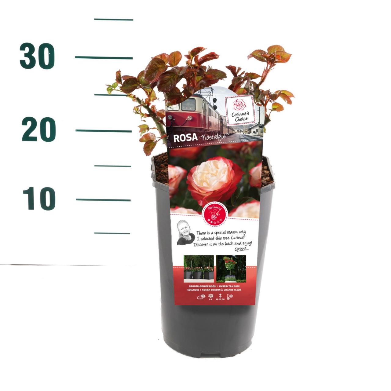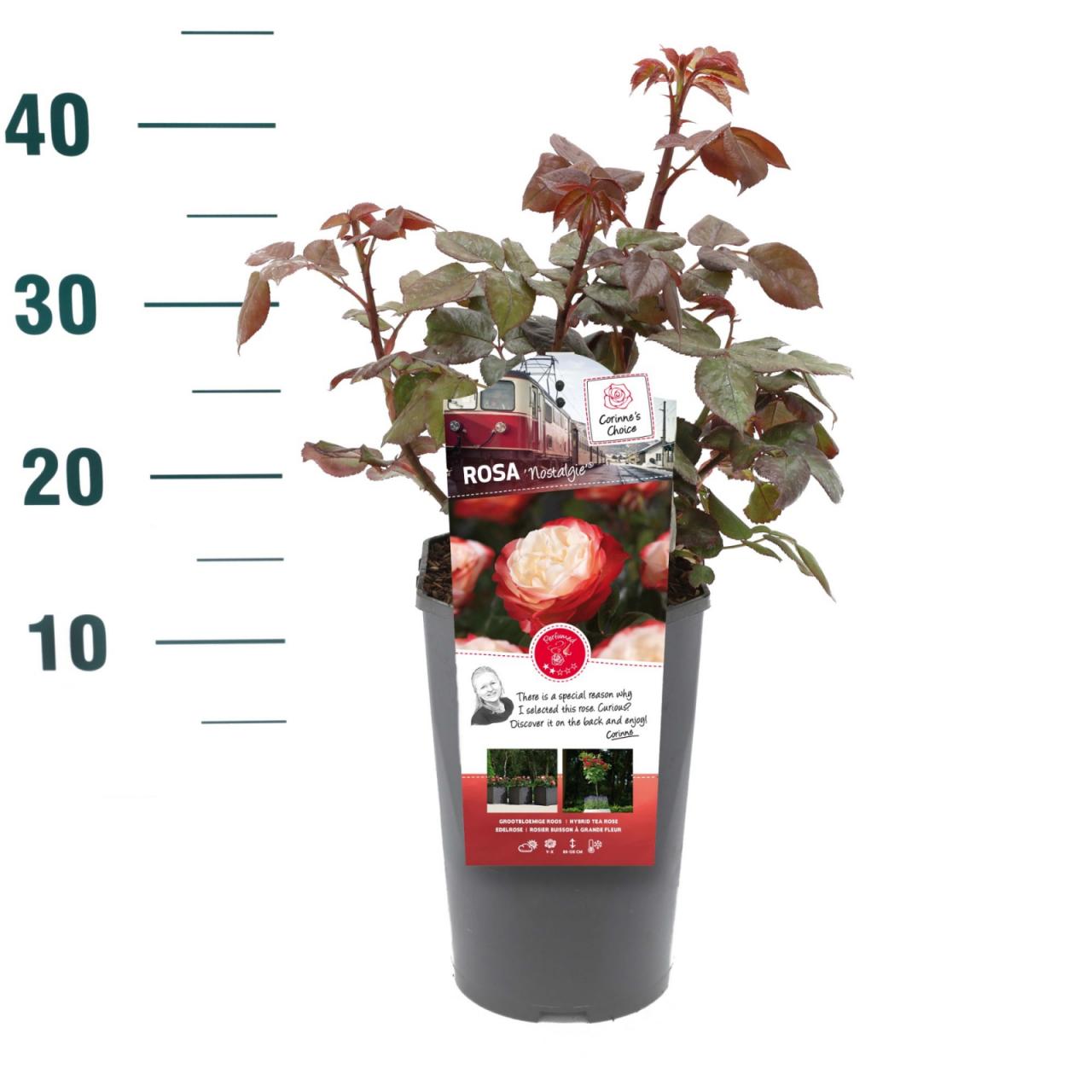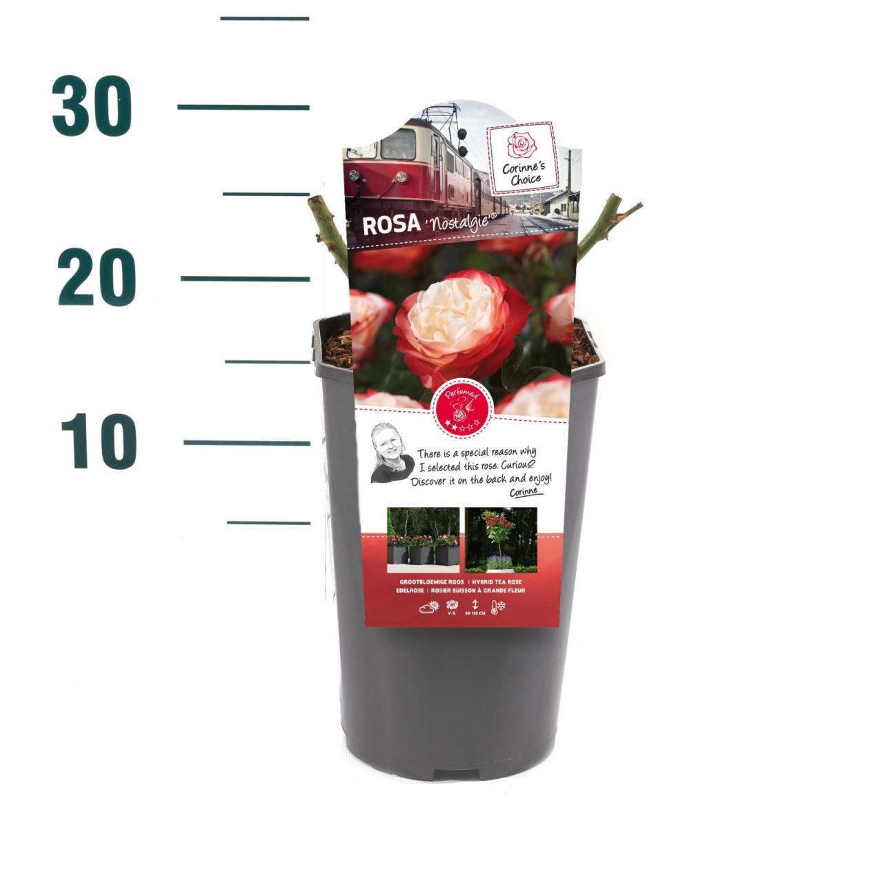 Vrtnica Nostalgie je pokončno in grmasto rastoča vrtnica z dišečimi in kremasto belimi cvetovi z rdečim robom, ki cvetijo od pozne pomladi do jeseni. Je kompaktna, listnata grmovnica s trnastimi stebli in pernato razdeljenimi in temno zelenimi svetlečimi listi. V višino doseže do 1 m in v širino do 0,7 m. Sadimo jo na sončno mesto v navadno prehranjeno vrtno zemljo, priporočljivo tam, kjer prej še niso rasle vrtnice.