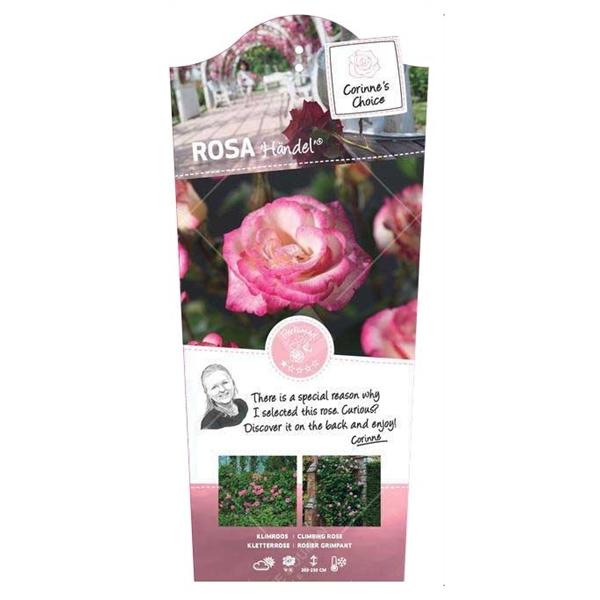Rosa hybrid Händel je priljubljena vzpenjava vrtnica z zelo prepoznavnimi, velikimi cvetovi v nežno kremno-beli barvi z izrazitim rožnatim robom. Cveti v valovih skozi sezono, zato je odlična izbira za pergole, ograje, loke in stene, kjer ustvari eleganten, romantičen učinek. Najlepše uspeva na sončni legi v rodovitnih, dobro odcednih tleh.