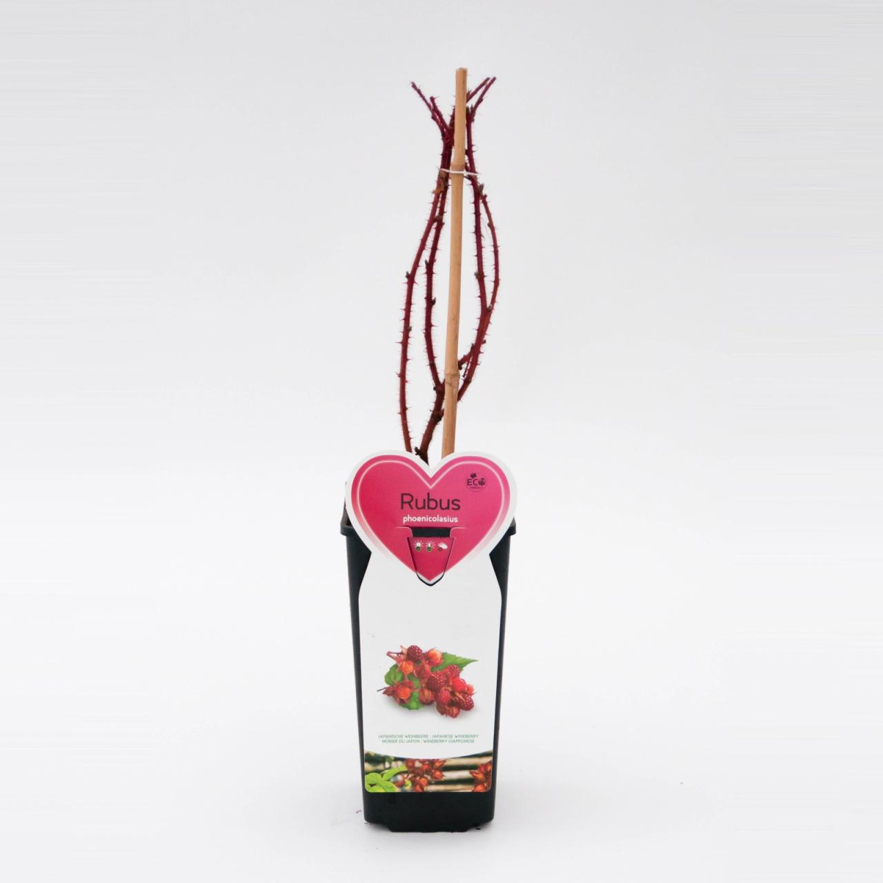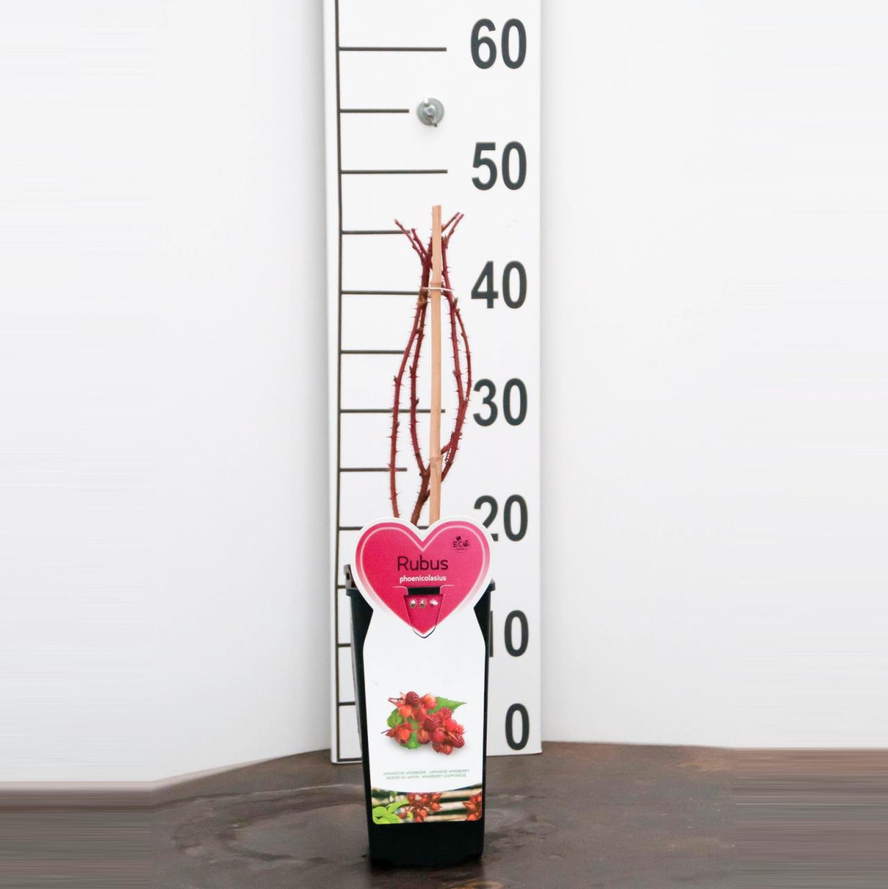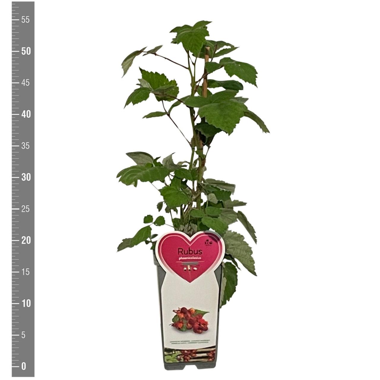 Japonska malina je bližnja sorodnica malin. Po obliki rasti je podobna črnim malinam, po barvi in okusu plodov pa bolj rdečim. Je bujne rasti z rdečkastimi poganjki, ki dosežejo do 3 m. Poganjki so obdani s številnimi mehkimi trni; med njimi je tudi nekaj večjih in ostrejših. Cveti v začetku poletja. Plodovi zorijo postopoma od julija do avgusta na enoletnih poganjkih, ki izraščajo iz dvoletnega lesa. So živo oranžno rdeči in v premeru merijo približno 2 cm. So rahlo lepljivi in zelo aromatični; okus je podoben malini z rahlim priokusom jagode.